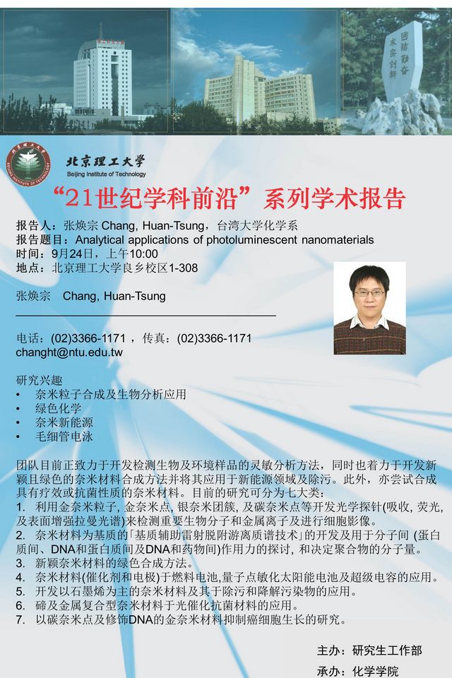 【化學(xué)學(xué)院】“21世紀(jì)學(xué)科前沿”張煥宗教授學(xué)術(shù)報告通知
