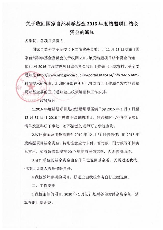 關(guān)于收回國家自然科學(xué)基金2016年度結(jié)題項目結(jié)余資金的通知