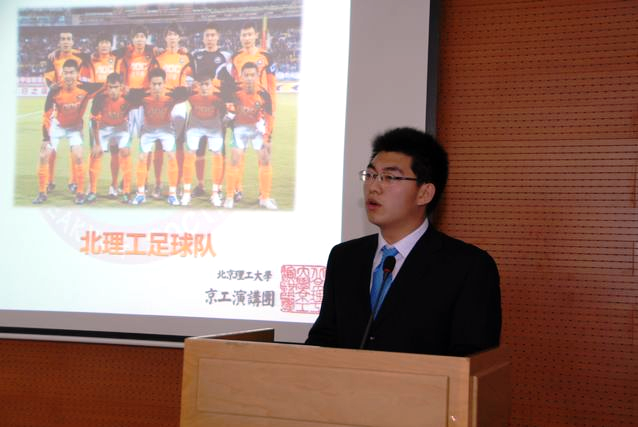 有這樣一支球隊,稱霸大學生足球聯賽數年;有這樣一支球隊,是參加中甲的唯一一支學生隊伍;有這樣一支球隊,在世界大學生運動會上取得第七名的成績,中國男足沒有做到的他們做到了,這就是令所有北理工人驕傲的北理足球隊.第四位上臺的李雪松同學為我們講述了北理工足球隊的動人故事.這雖然只是一支校園隊伍,雖然他們的訓練條件很簡陋,經濟條件,訓練場地也都很有限,但是他們用自己堅強的意志,超強的身體素質,和極強的團隊精神創造了一個學生球隊的奇跡.足球不是個人的運動,團隊精神才是足球這項集體運動的靈魂.理工的運動員們正是秉承了這種團隊精神才創造了一個又一個輝煌。